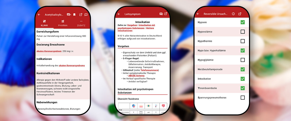 - Eine umfangreiche Bibliothek zum Nachschlagen von Krankheitsbildern und medizinischen Fachbegriffen (von A wie ARDS bis Z wie zerebrale Einklemmung)
